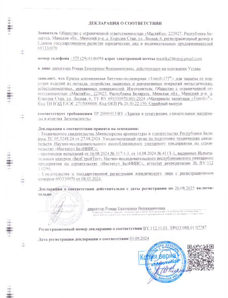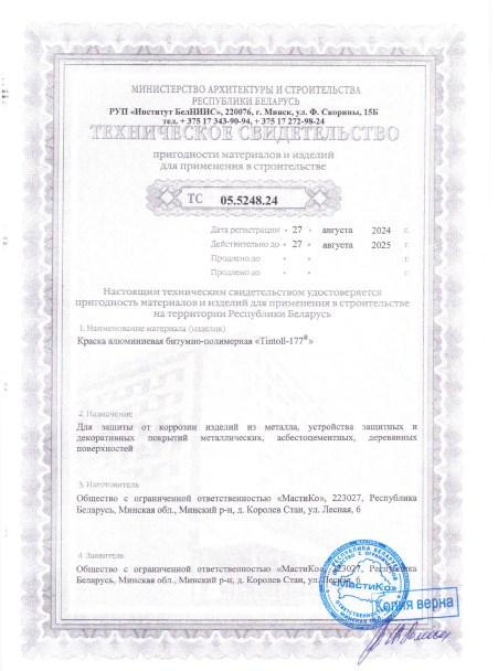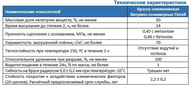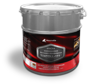 Краска битумно-полимерная алюминиевая Tintoll-177® представляет собой готовая к применению композиция на битумно-SBS-полимерной основе, содержащая модифицирующие и целевые добавки и растворитель. Покрытие обладает высокой эластичностью, хорошей адгезией к защищаемым поверхностям, устойчивостью к воздействию повышенных температур (до +150 °С) и УФ-части спектра солнечных лучей.